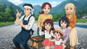 けれど翌朝,ひかりの「アウトドア魂」が れいとあかりを巻き込んで,河原でバーベキュー開幕!